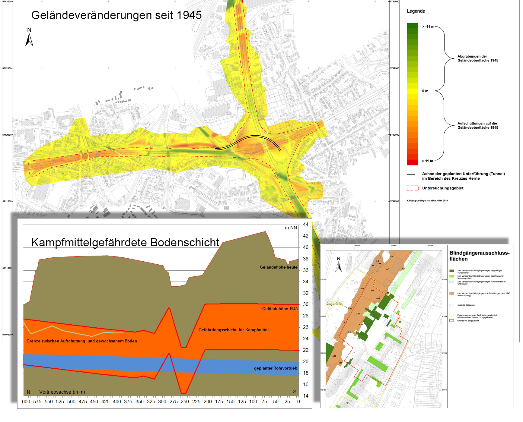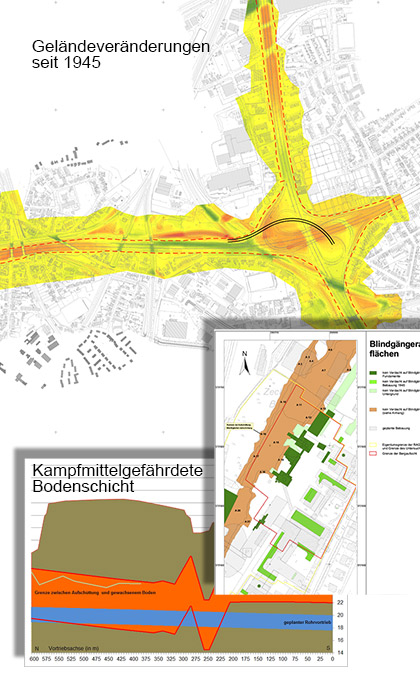 | Kampfmittel Kampfmittelgefahren Die Gefahrenbeurteilung von Kampfmittelverdachtspunkten bzw. -flächen ist vor dem Hintergrund der seit 1945 stattgefundenen Geländeveränderungen vorzunehmen. Der Abtrag und die Überschüttung kampfmittelbelasteter Schichten führen zu veränderten Beurteilungsgrundlagen. Nachträglich eingebrachte und kampfmittelbelastete Bodenmaterialien können wiederum zu einer sekundären Belastung führen. Durch die digitale Modellierung der Geländeoberfläche von 1945 erfassen wir nachträgliche Geländeveränderungen in ihrer räumlichen Ausdehnung und ihrer Mächtigkeit. Konkrete Aussagen zur derzeitigen Lage kampfmittelbelasteter Schichten und die Beurteilung der Gefahren im Rahmen der beabsichtigten Baumaßnahmen werden möglich. Darüber hinaus kartieren wir als Blindgängerausschlussflächen solche Teilbereiche aus, in denen aus verschiedenen Gründen nicht mit dem Verbleib von Blindgängern im Boden zu rechnen ist. Dies gilt beispielsweise für Flächen, die nach dem Krieg in ausreichender Mächtigkeit abgegraben wurden oder während der Bombardierungen nachweislich eine geschlossene und unbeschädigte Bebauung aufwiesen. Auf Gewerbe- und Industriestandorten mit einem generellen Kampfmittelverdacht kann der Untersuchungsaufwand für technische Untersuchungen unter diesen Voraussetzungen deutlich reduziert werden. |