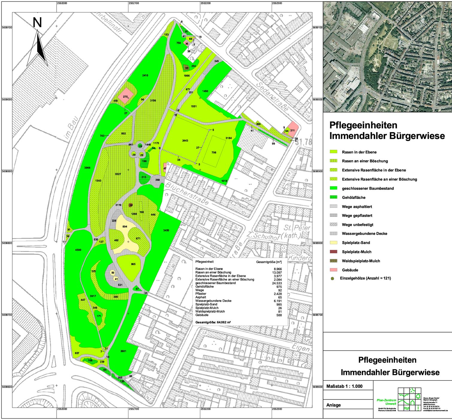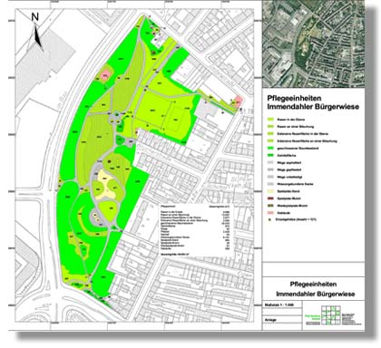 | Luftbildauswertung Gebiets- inventarisierungen Für die kommunale Planung und Steuerung werden Grundlagen- informationen benötigt, die in Form von Baum-, Grünflächen-, Versiegelungs- oder Brachflächenkatastern abgelegt sind. Auf der Grundlage verzerrungsfreier Luftbilder kartieren wir Flächen und Informationen mit allen zu erhebenden Parametern in einem Geografischen Informationssystem (GIS). Dieses ermöglicht neben der kartographischen Aufbereitung der Informationen die komfortable Verwaltung und Analyse räumlicher Daten (siehe auch Geodatenmanagement). Auf diese Weise entsteht beispielsweise eine hervorragende Datenbasis zur Verwaltung, Beurteilung, Pflege und Entwicklung von Grünflächen. |